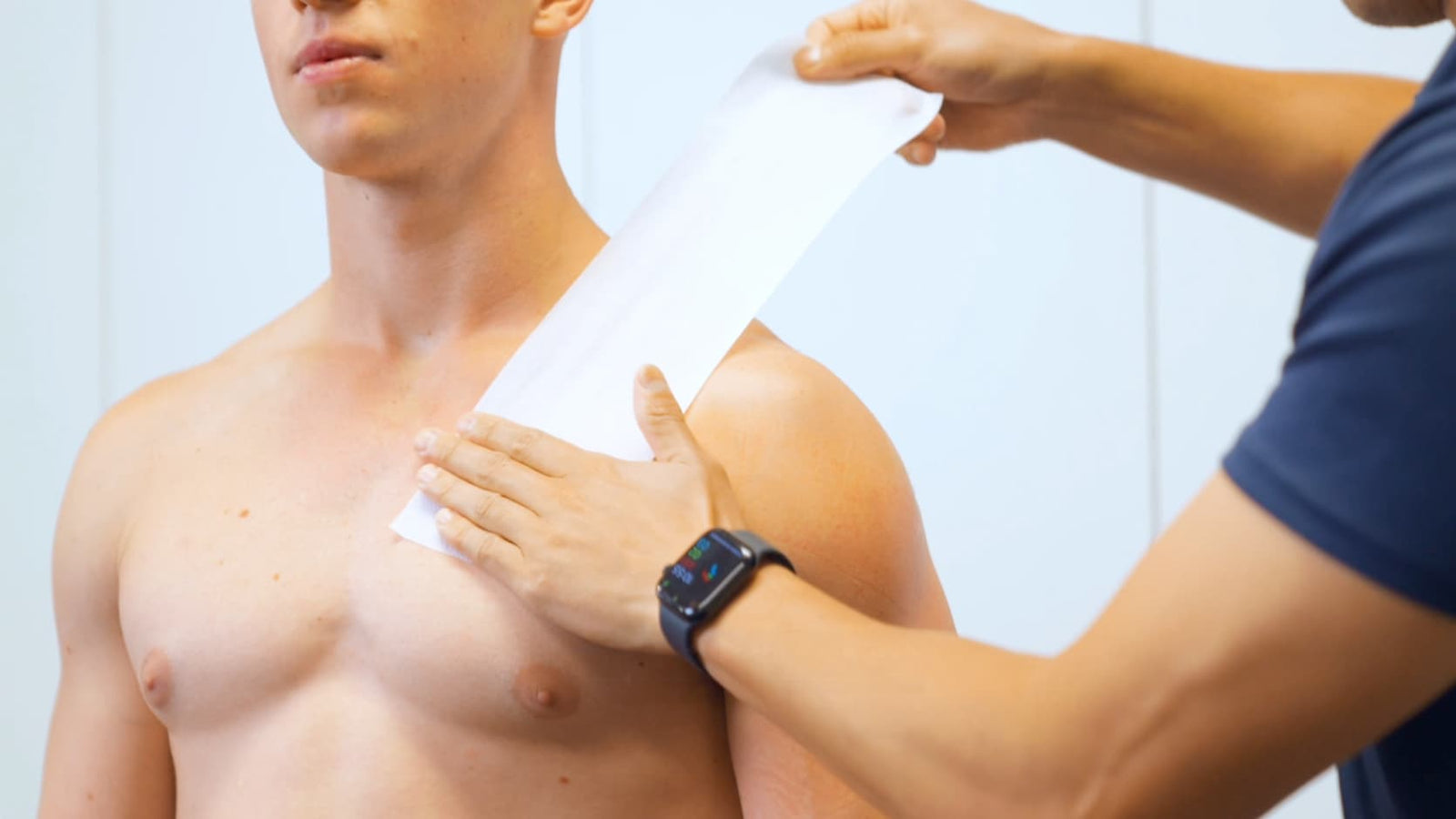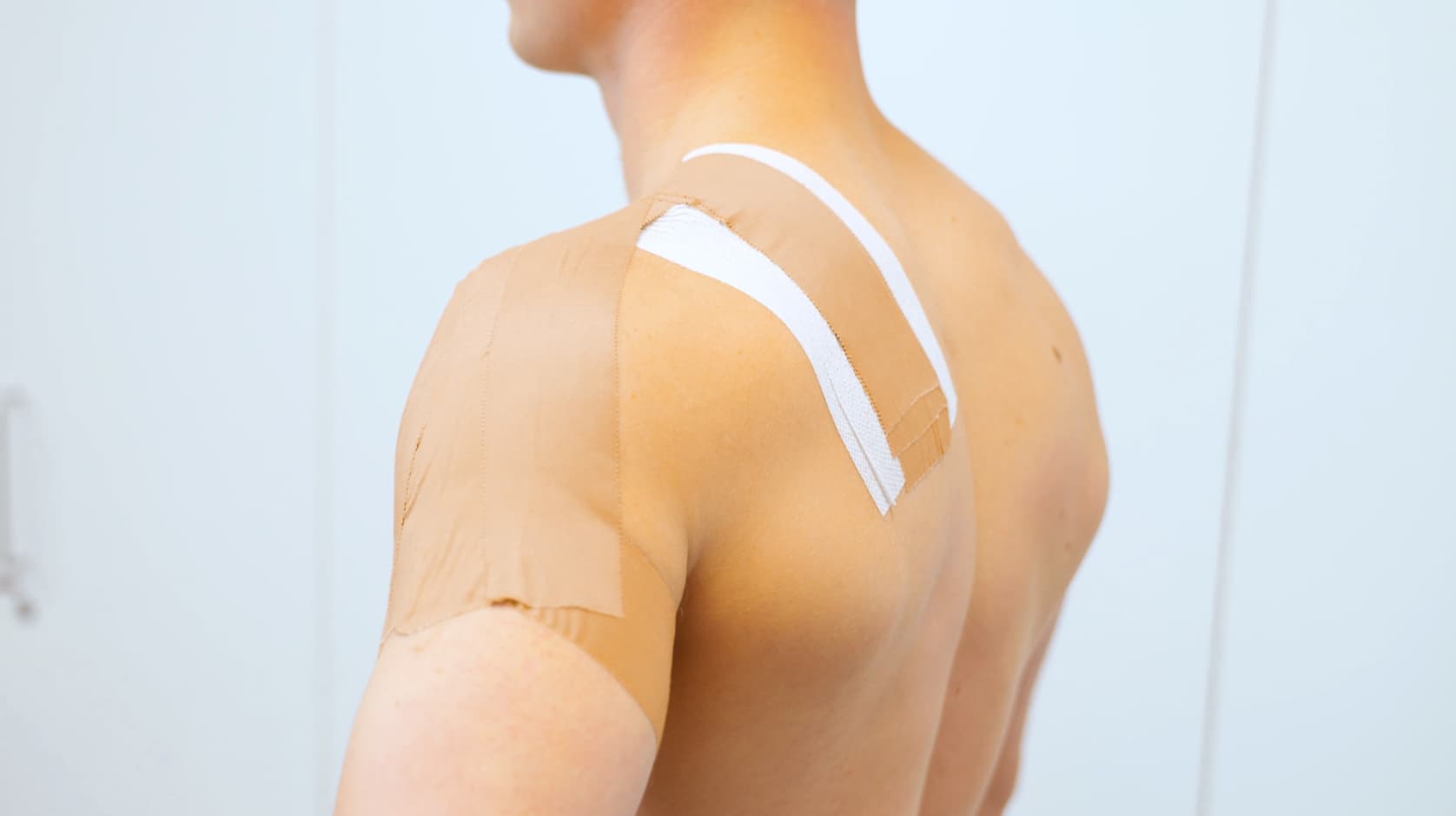 Apply GoLevita’s UnderFix from the lower chest line, over the shoulder, and across the upper back. This protects the skin in a sensitive area commonly irritated by direct tape.