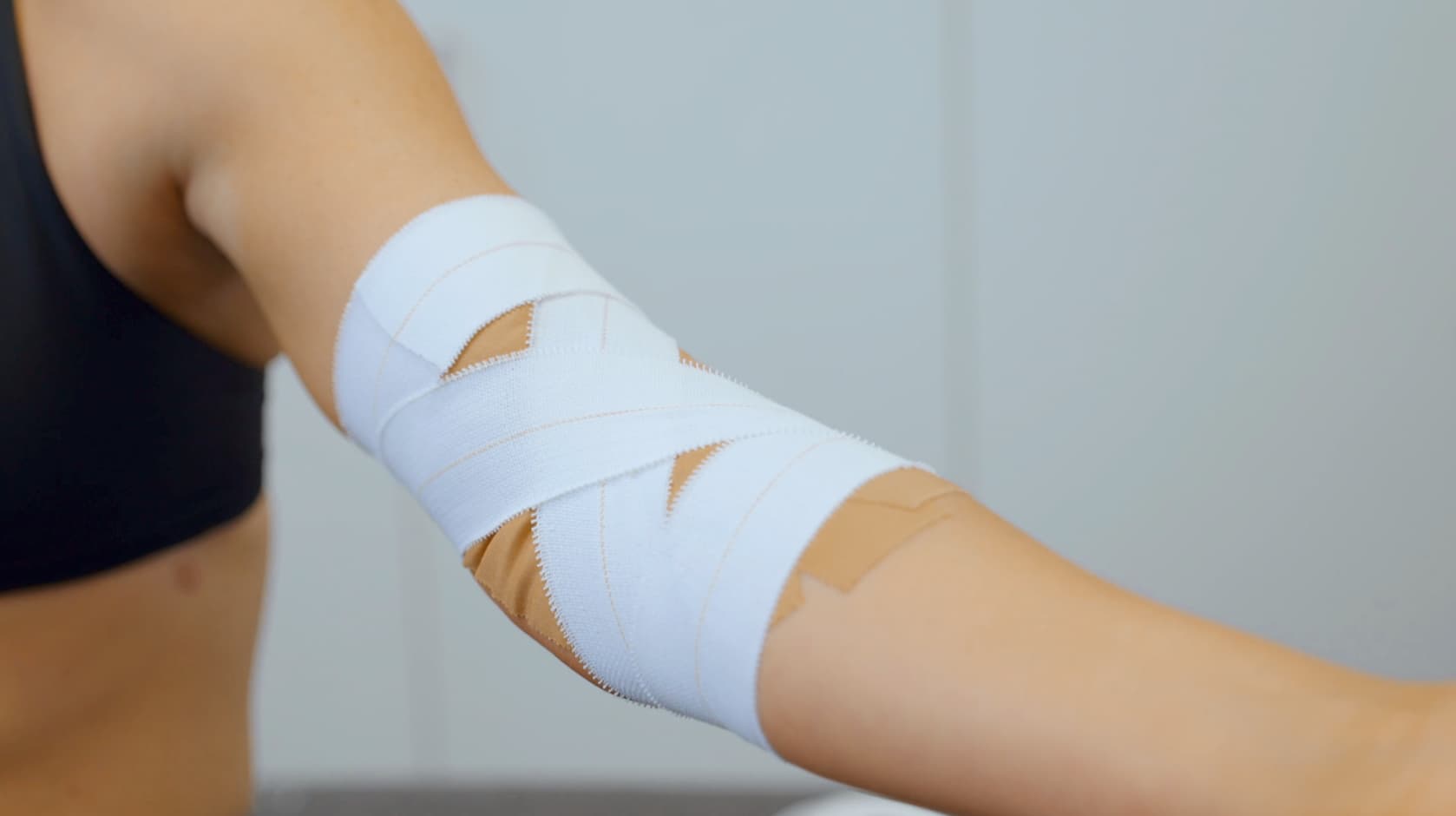 - Apply tape from the medial elbow toward the lateral arm, reinforcing the