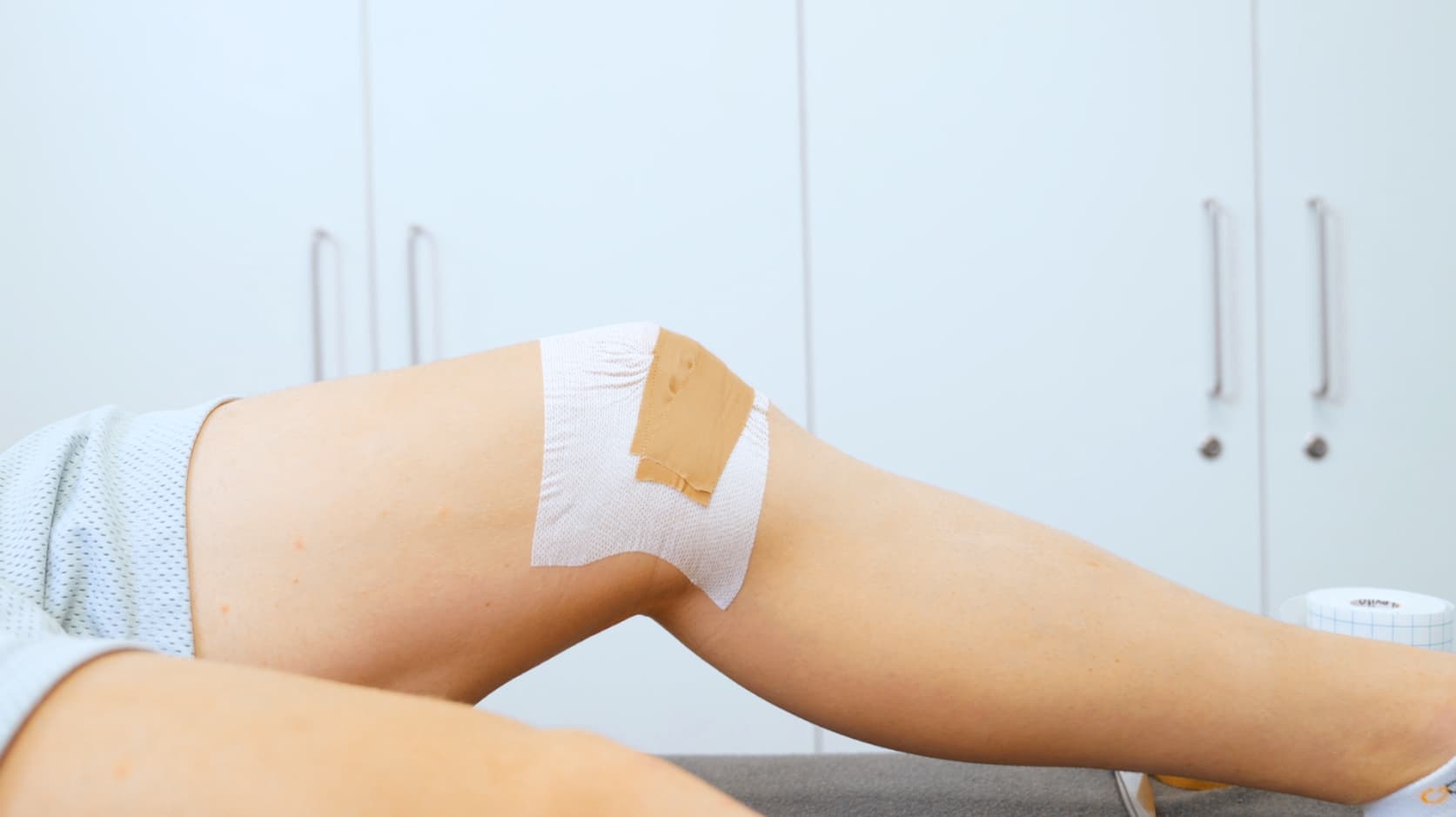 With the patient’s leg extended, apply GoLevita UnderFix directly over the anterior knee. Ensure there are no creases. This layer reduces skin irritation and enhances tape comfort and durability for long-term wear.