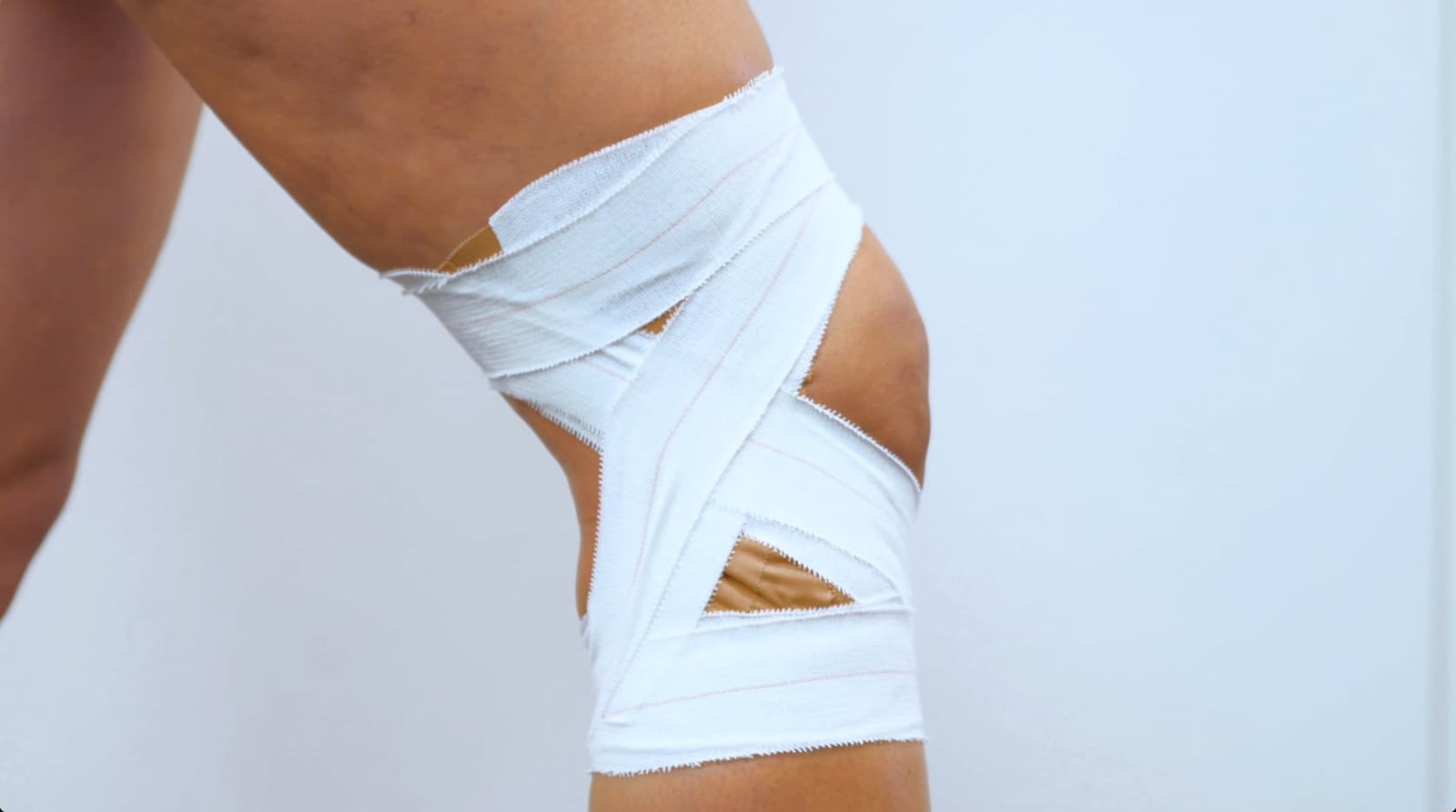 - Wrap the elastic tape around the knee, following the path of the rigid tape.